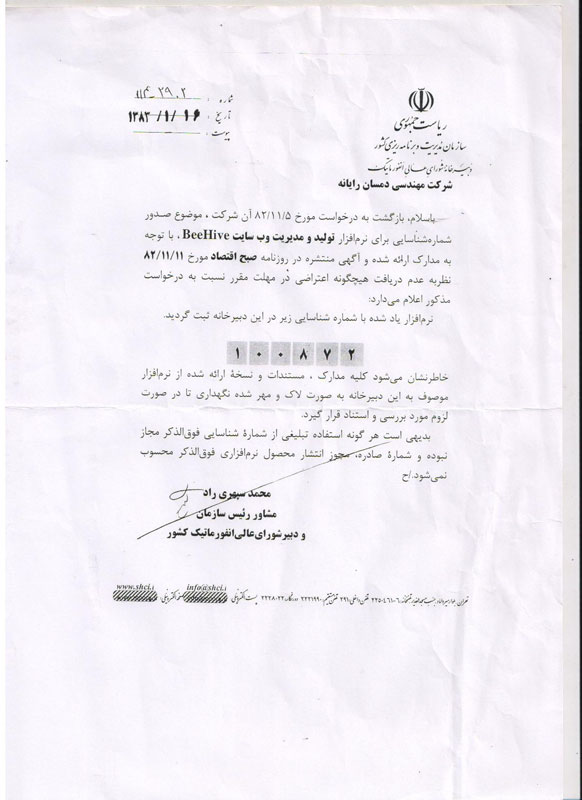 مجوز ثبت نرم افزار توليد و مديريت وب سايت BeeHive CMS